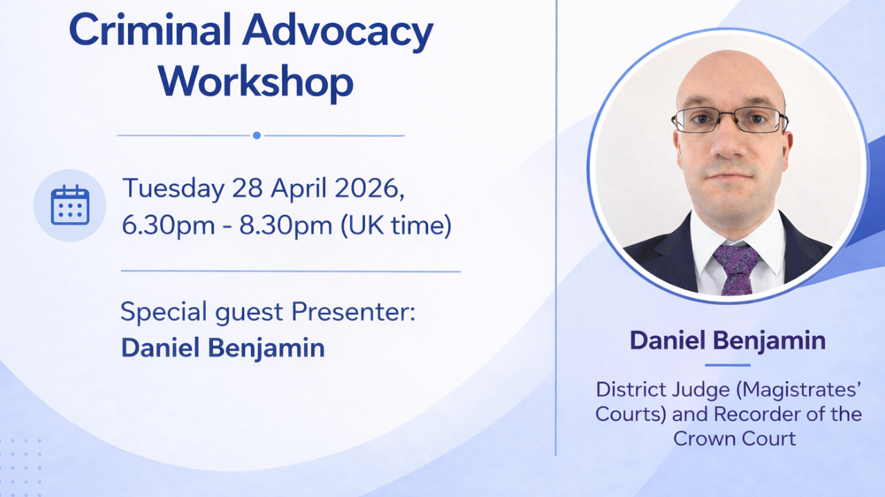 It offers a valuable opportunity to test your advocacy in a supportive setting, refine your technique, and receive constructive feedback. The session will be led by special guest presenter Daniel Benjamin, District Judge and Crown Court Recorder.